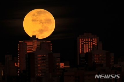 [브라질리아= AP/ 뉴시스] 26 일 새벽(현지시간) 브라질 브라질리아에서 건물들 뒤로 개기월식이 관측되고 있다. 이번 개기월식은 슈퍼문과 동시에 일어나면서 '슈퍼 블러드문'이 관측됐다. 2021.05.26. https://n.news.naver.com/article/003/0010518742?cds=news_edit