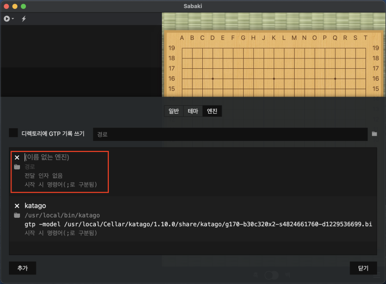 두번째 줄은 엔진 설치 경로입니다. 터미널에서 which katago 를 쳐서 나온 경로를 적어줍니다.