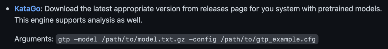 gtp -config $(brew list --verbose katago | grep gtp*.cfg) -model $(brew list --verbose katago | grep .gz | head -1)code : gtp -config $(brew list --verbose katago | grep gtp*.cfg) -model $(brew list --verbose katago | grep .gz | head -1)