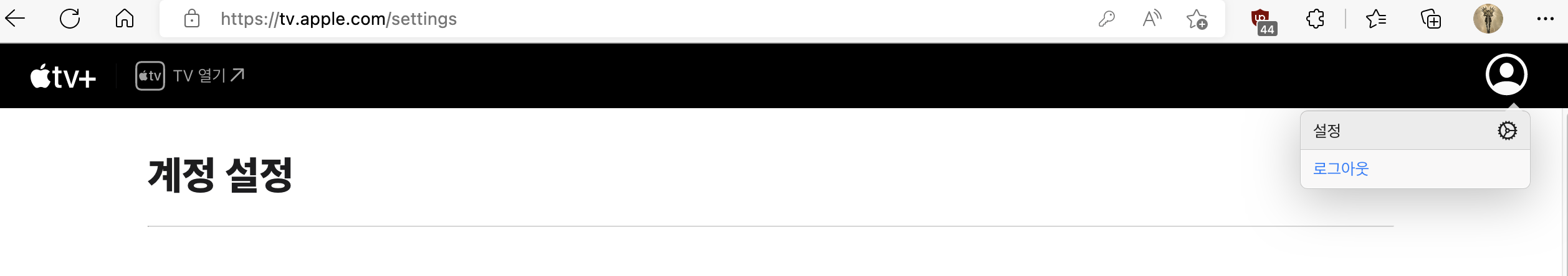 우선 애플TV플러스 홈페이지에 로그인하고, 우측 상단 사람 모양 클릭하여 설정으로 들어간다.