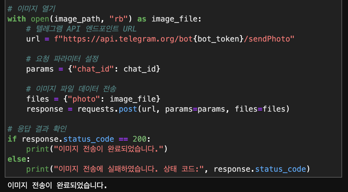 import os import requests # 텔레그램 봇 토큰(Token)을 입력하세요. bot_token = "YOUR_BOT_TOKEN" # 텔레그램 채팅 ID를 입력하세요. chat_id = "YOUR_CHAT_ID" # 이미지 파일 경로를 입력하세요. image_path = "YOUR_IMAGE_PATH" # 이미지 열기 with open(image_path, "rb") as image_file: # 텔레그램 API 엔드포인트 URL url = f"https://api.telegram.org/bot{bot_token}/sendPhoto" # 요청 파라미터 설정 params = {"chat_id": chat_id} # 이미지 파일 데이터 전송 files = {"photo": image_file} response = requests.post(url, params=params, files=files) # 응답 결과 확인 if response.status_code == 200: print("이미지 전송이 완료되었습니다.") else: print("이미지 전송에 실패하였습니다. 상태 코드:", response.status_code) # 챗GPT 설명 위의 코드에서는 requests 라이브러리를 사용하여 텔레그램 API에 POST 요청을 보내는 방식으로 이미지를 전송합니다. 요청 URL은 https://api.telegram.org/bot{bot_token}/sendPhoto로 설정하고, 요청 파라미터로 chat_id를 지정하여 메시지를 보낼 채팅 ID를 설정합니다. 이미지 파일은 files 파라미터를 통해 전송합니다. 이 방법을 사용하면 이미지가 텔레그램으로 전송될 것입니다. 이전에 발생한 오류를 우회하여 문제를 해결하기 위해 다른 방법을 시도해보시기 바랍니다. 죄송합니다.