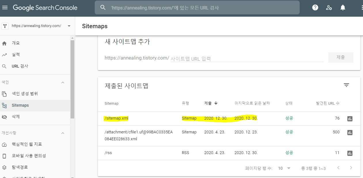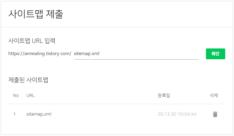 기존 URL을 삭제한 후 새로운 sitemap.xml을 입력하고 확인만 누르면 끝입니다. 간단하네요.